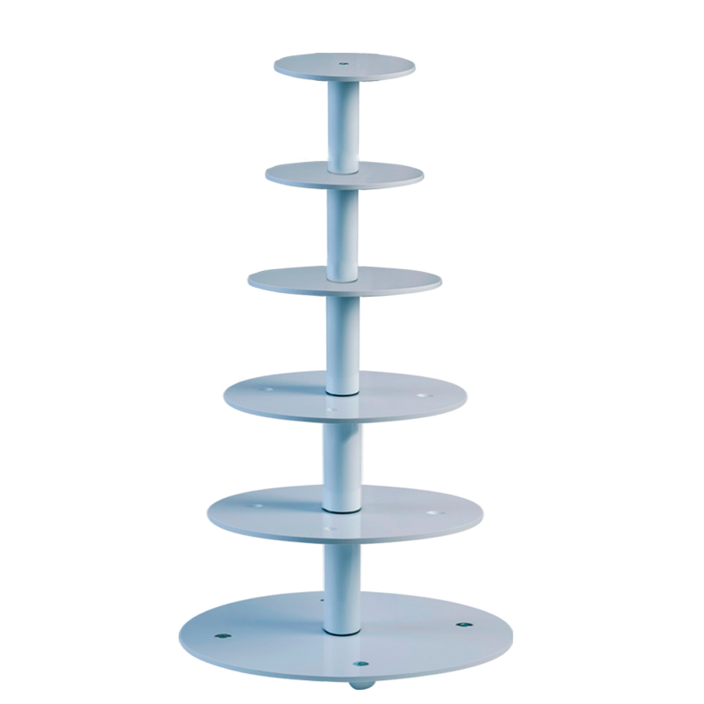 Support à gâteaux à 6 niveaux en plastique ou en métal, idéal pour présenter des gâteaux et des tartes lors d'événements et de cérémonies religieuses. Ce modèle est conçu pour servir 130-132 portions.
