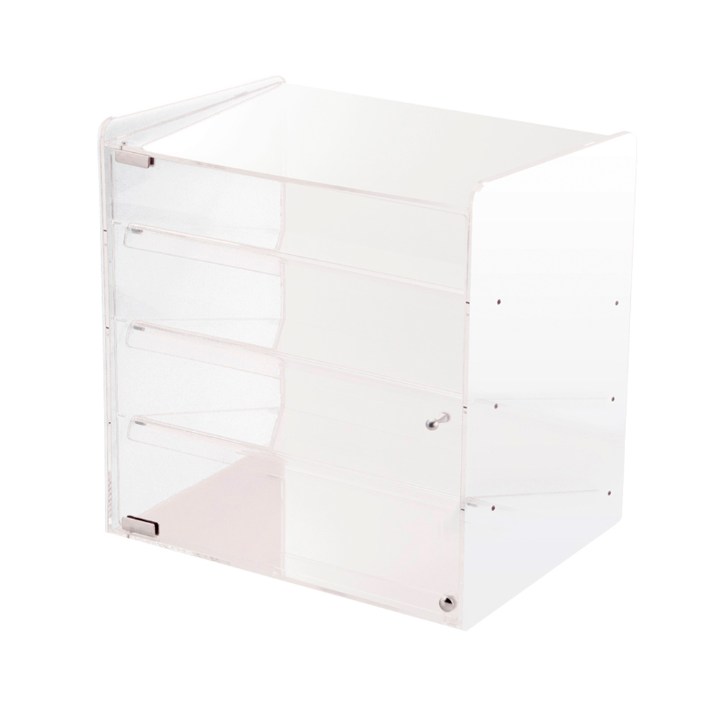Vitrine en plexiglas avec trois étagères inclinées (plus la base) et une porte. Idéale pour ranger les brioches, les cornets, les pâtisseries sucrées et salées et bien d'autres choses encore dans les établissements tels que les bars, les restaurants, les hôtels et les pâtisseries. Disponible avec des côtés de différentes couleurs.