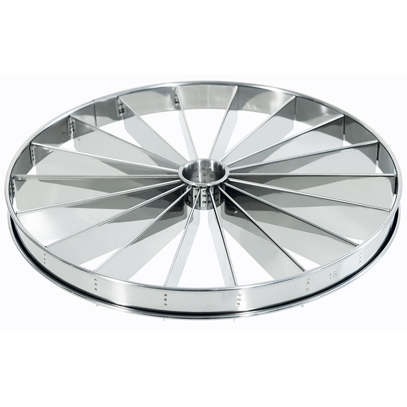Marqueur de portions en acier inoxydable pour les gâteaux d'un diamètre de 33 cm. Le portionneur peut être utilisé des deux côtés (les cavités désignent les portions qui peuvent être réalisées).