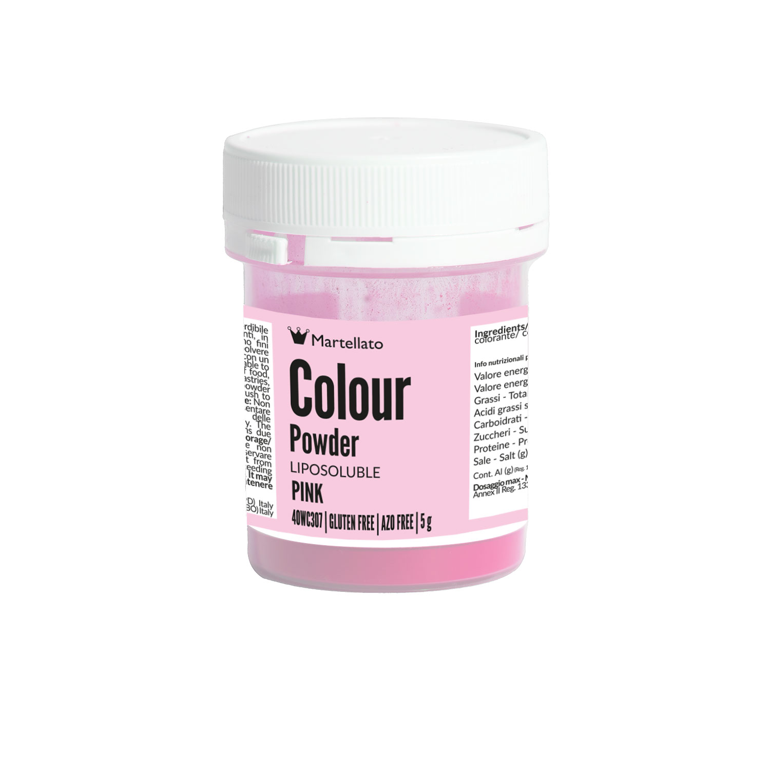 Colorant en poudre rose liposoluble adapté à la coloration dans la masse de produits à base de matières grasses tels que le beurre de cacao, le chocolat blanc, la crème au beurre, la pâte d'amande, la pâte à sucre, les parfaits. Il peut être utilisé sur la surface avec un pinceau tel quel, dilué avec de l'alcool ou de la gomme-laque liquide et ensuite brossé directement sur la surface à décorer.