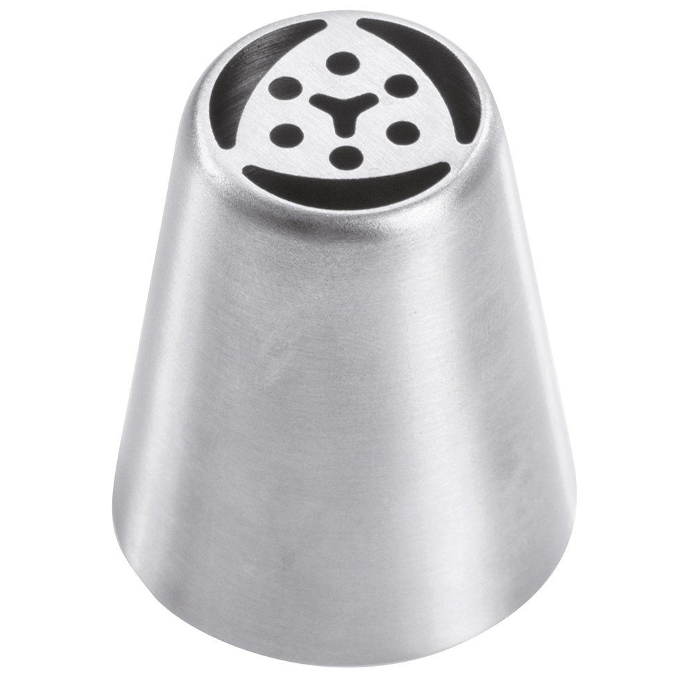 Embout en acier inoxydable pour sac à poche ou poche à pâtisserie avec forme florale élaborée. Cette buse est sans soudure, ce qui garantit un écoulement régulier du produit et une grande résistance.