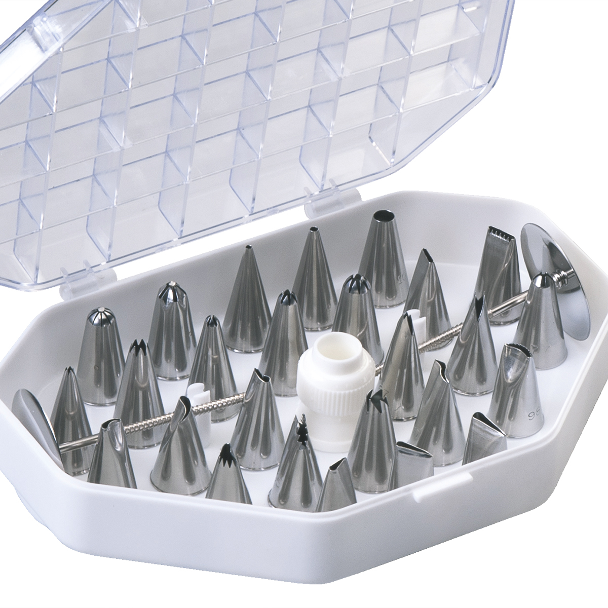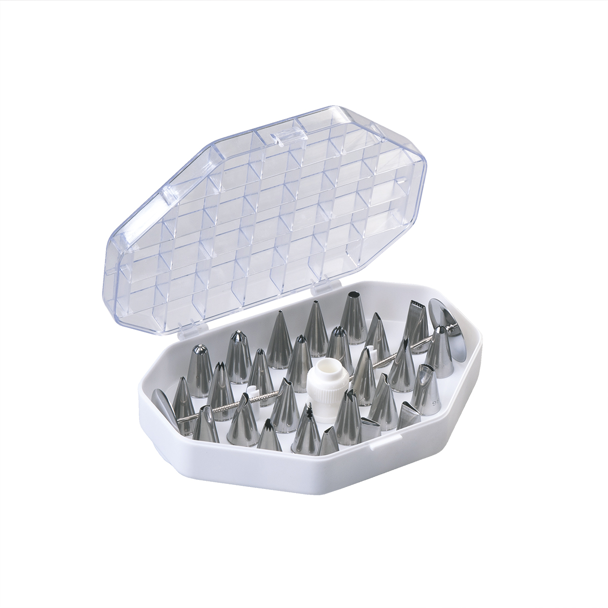 Kit composé de 26 buses de sac à poche en acier inoxydable, d'un adaptateur et de 2 clous à fleurs, le tout dans une boîte de transport pratique en plastique. Buses de différentes tailles.