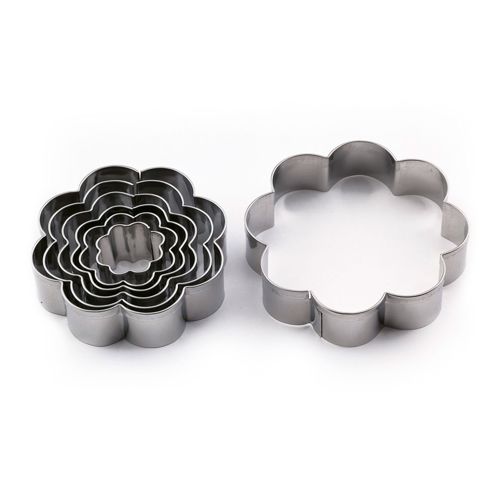 Jeu d'emporte-pièces en acier inoxydable en forme de fleur avec 8 pétales, avec des bords extra lisses pour des coupes nettes et précises. Dans la boîte (en acier) sont inclus 7 moules avec des tailles : 90x90mm, 75x75mm, 70x70mm, 55x55mm, 45x45mm, 40x40mm, 25x25mm.
