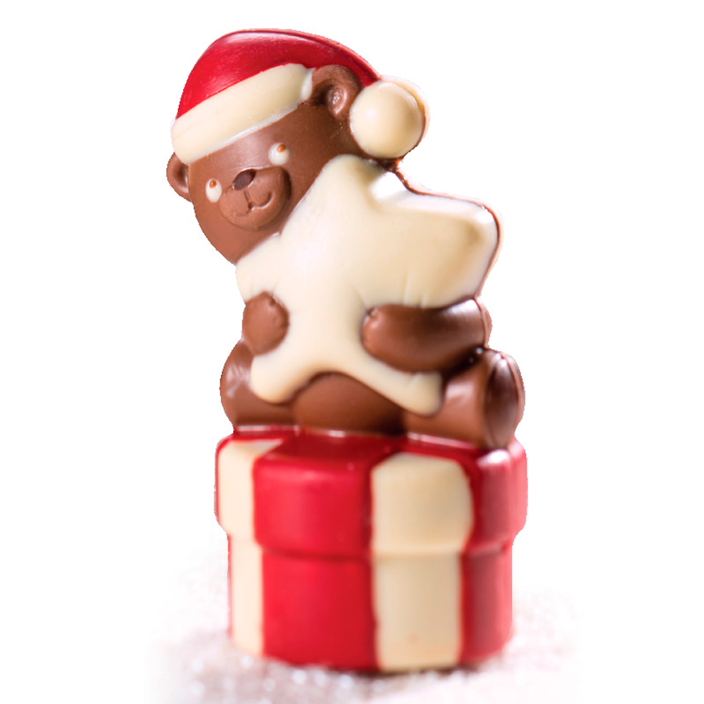 Moule en plastique rigide thermoformé pour sujets de Noël en chocolat avec corps creux en forme de petits ours. Avec des ressorts pour la fixation.