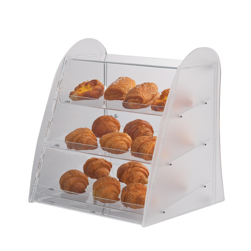 Vitrine courbe en plexiglas avec trois étagères inclinées et une porte. Parfait pour ranger les brioches, les cornets, les pâtisseries sucrées et salées et bien plus encore dans les bars, les restaurants, les hôtels et les pâtisseries. Distance entre les étagères : 11cm